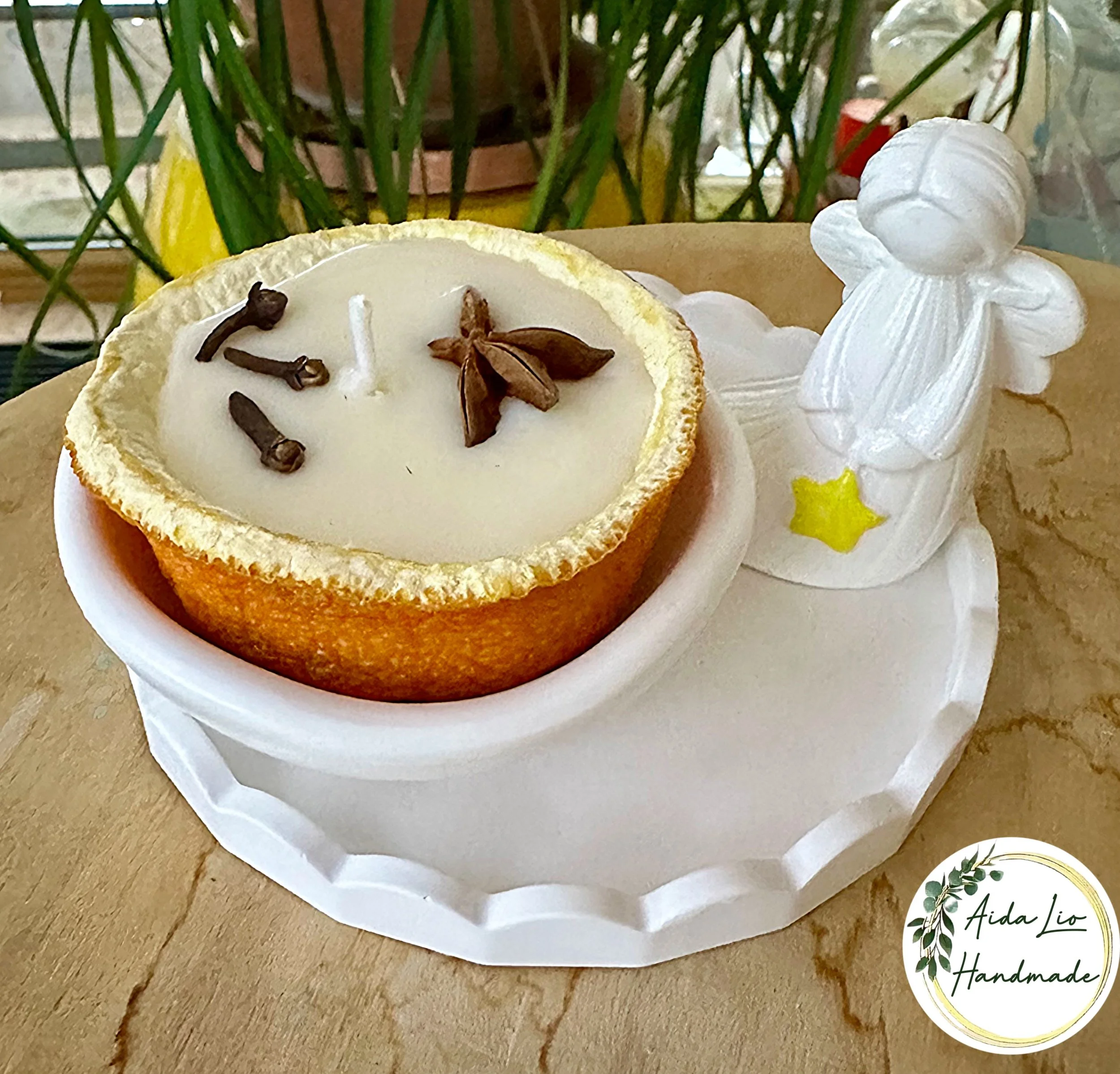 Îngerul cu mirodenii - decorațiune handmede cu elemente ceramice turnate manual și lumânare din ceară naturală parfumată turnată în coajă uscată de portocală - 75 lei