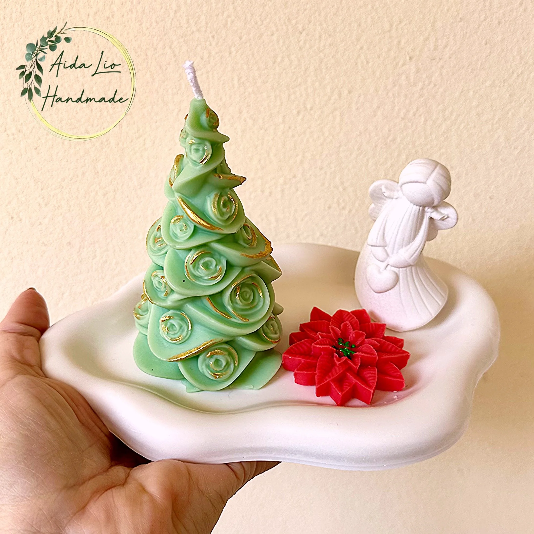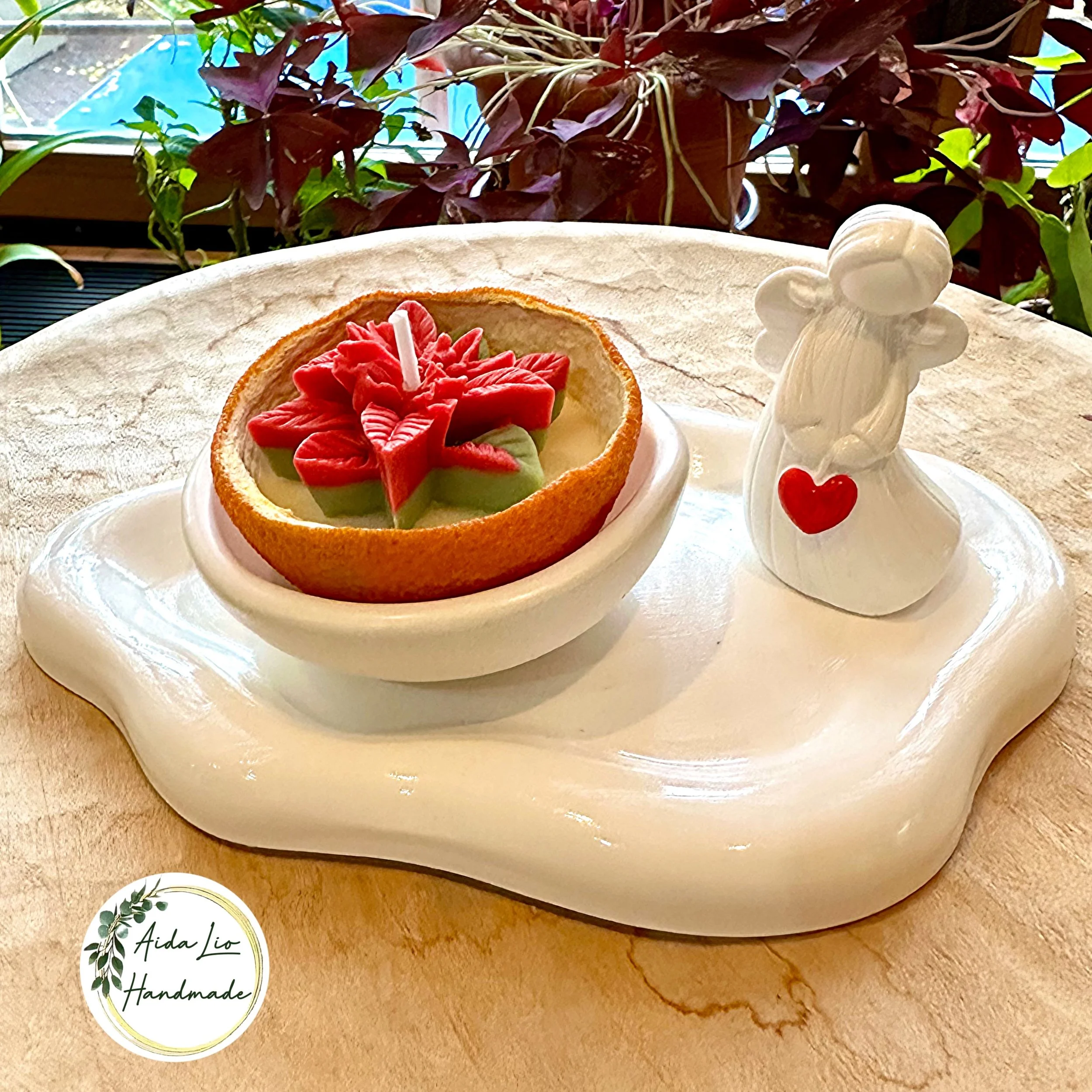 Crăciunul Acasă - decorațiune handmade cu tăviță, înger și bol turnate manual din praf ceramic și lumânare din ceară naturală parfumată turnată în coajă uscată de portocală - 80 lei