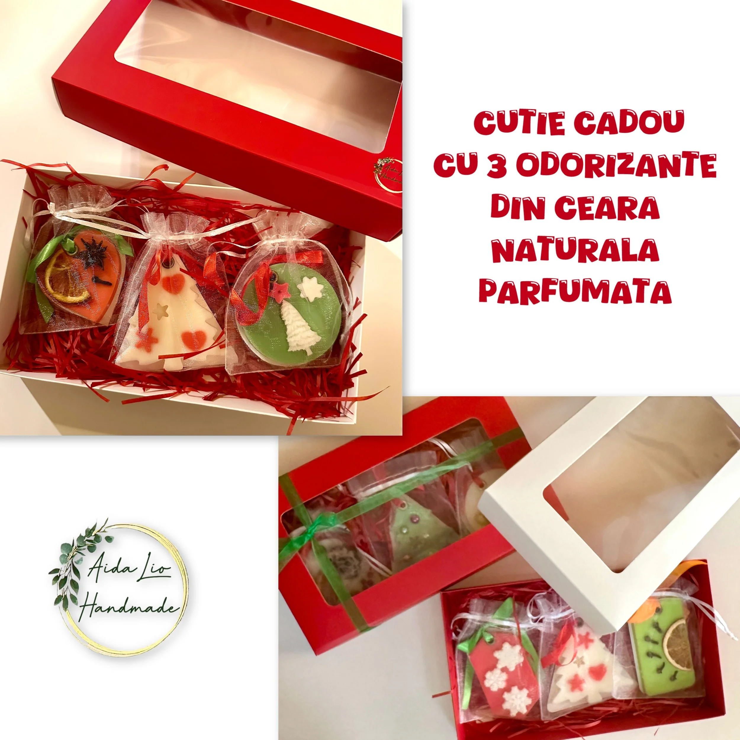 Smell of Christmas - Set 3 lumânări handmade din ceară naturală parfumată (diverse modele cu specific de Crăciun) în cutie cadou - 90 lei